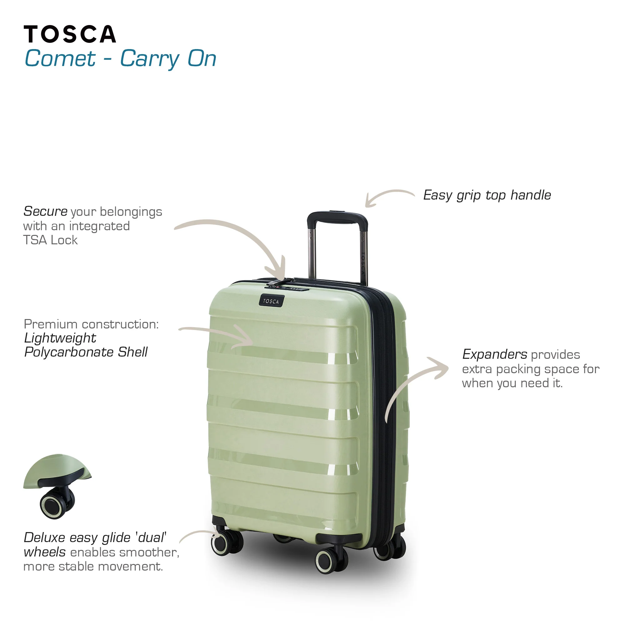 The TOSCA Comet Trolley Case is a lightweight hard case luggage range, providing travellers with a light, durable and stylish case packed full of features. The raised and stylish textured design gives a modern feel to design whilst the premium polypropylene outer shell provides superior protection for your packed belongings. The Sage Green colour-way is an exciting new addition to one of the brands best selling hard luggage cases.