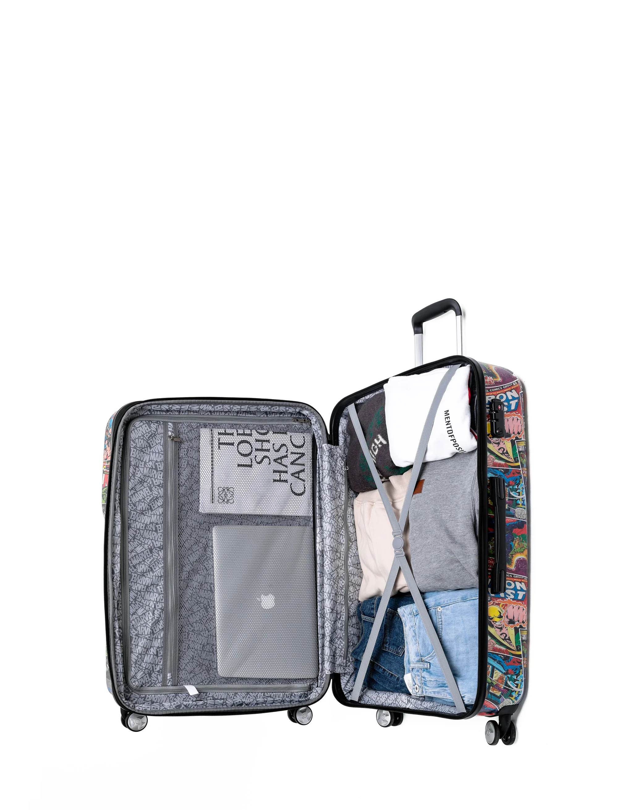 Equipped with smooth 360° spinner wheels, this case glides easily through airports, train stations, and hotels. The sturdy telescopic handle and side carry handle provide flexible carrying options, while the zippered interior divider and elastic cross straps help keep clothing and essentials neatly organised during your journey. Compact enough for overhead compartments yet spacious enough for all your travel must-haves, the MARVEL Comic Onboard Luggage Case combines style, practicality, and superhero power for your next adventure.