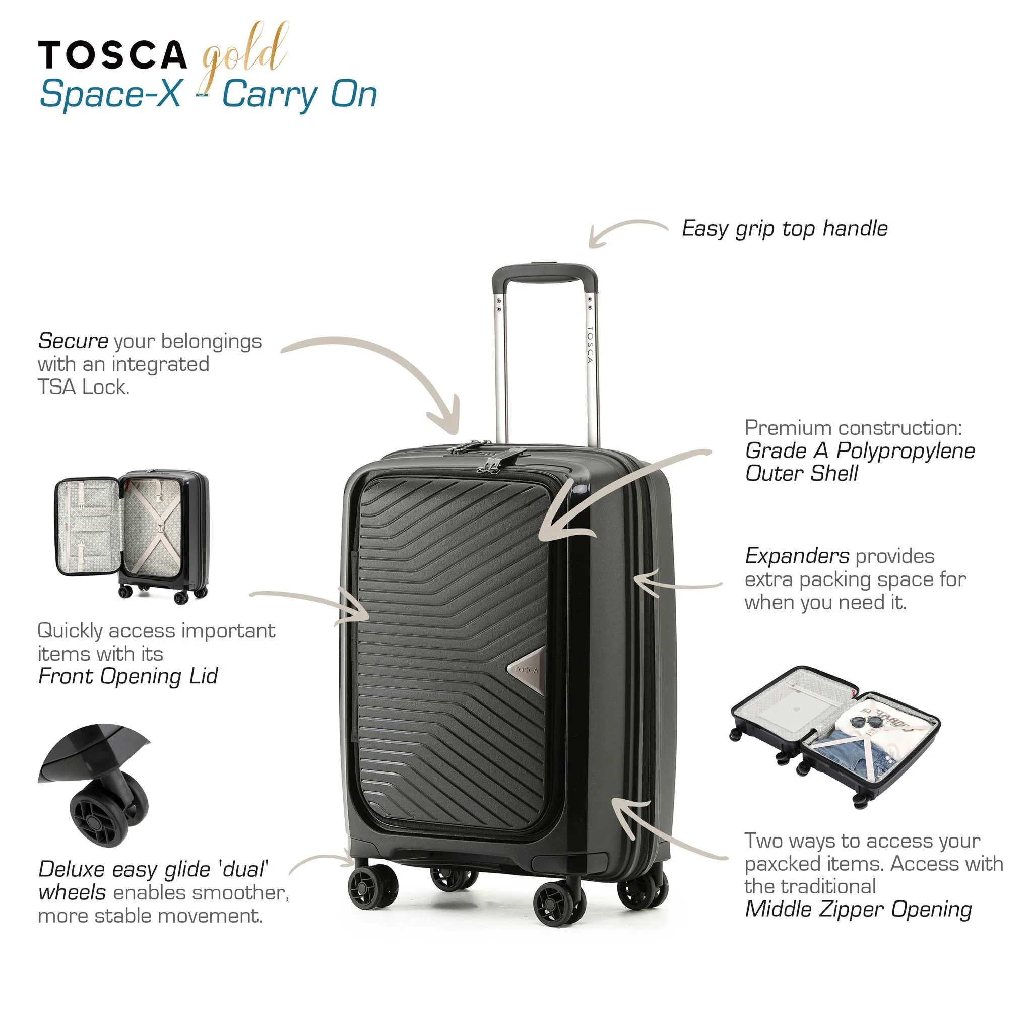 The TOSCA Space-X onboard luggage case is built to withstand the rigours of travel. Its hard-shell exterior, with a unique metallic finish, provides superior protection for your belongings, while the spacious interior offers ample room for all your essentials. With its lightweight design and smooth-rolling wheels, this luggage case is easy to manoeuvre through airports and other travel hubs. What really sets the TOSCA Space-X apart is its innovative features, including its front lid & middle zipper openings. Whether you're traveling for business or pleasure, the TOSCA Space-X onboard luggage case is the perfect choice for the modern traveller.