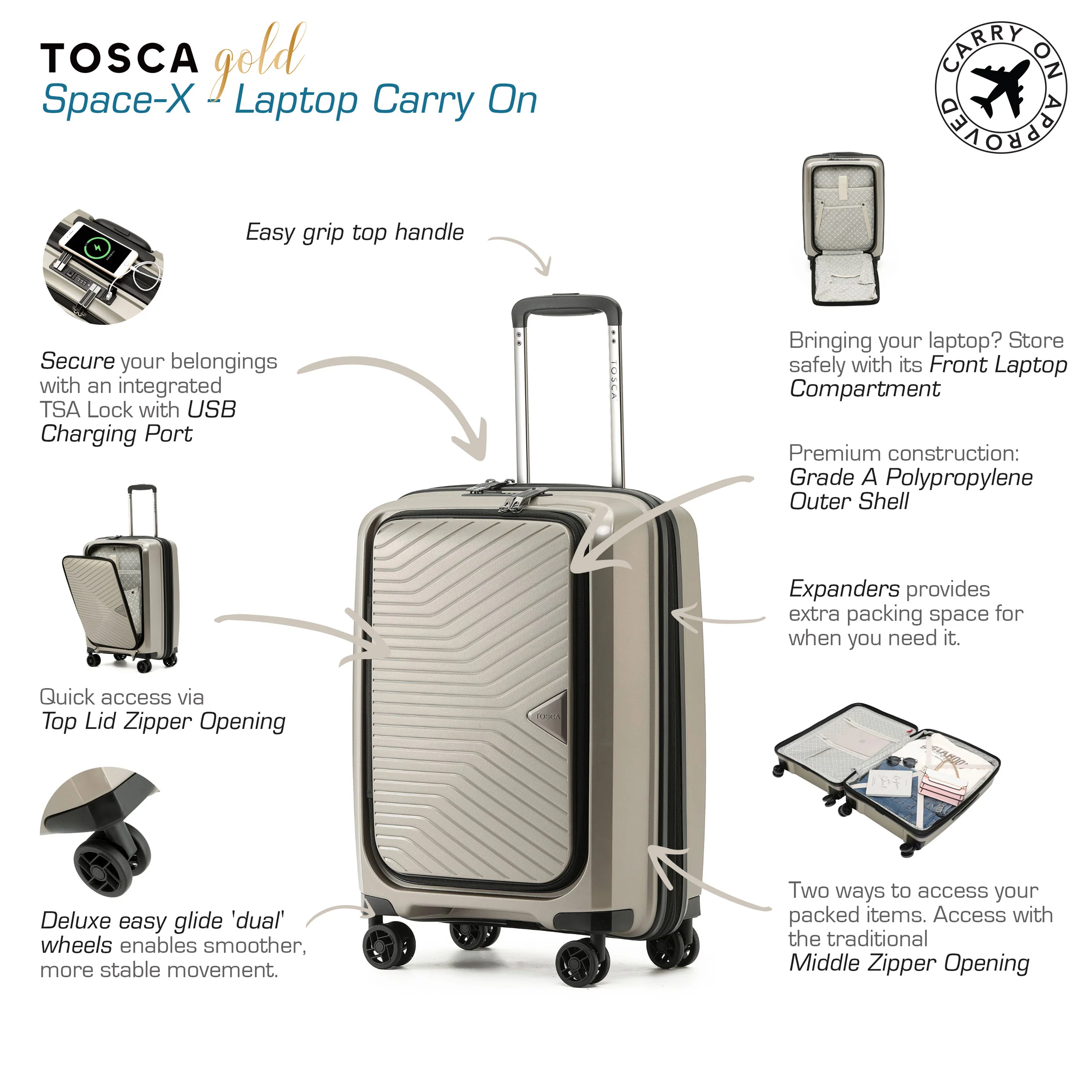 The TOSCA Space-X laptop onboard luggage case is built to withstand the rigours of travel. Its hard-shell exterior, with a unique metallic finish, provides superior protection for your belongings, while the spacious interior offers ample room for all your essentials. With its lightweight design and smooth-rolling wheels, this luggage case is easy to manoeuvre through airports and other travel hubs. What really sets the TOSCA Space-X apart is its innovative features, including its front lid & traditional middle zipper opening. If you're travelling for business, the TOSCA Space-X onboard Luggage Case is the perfect choice for you.